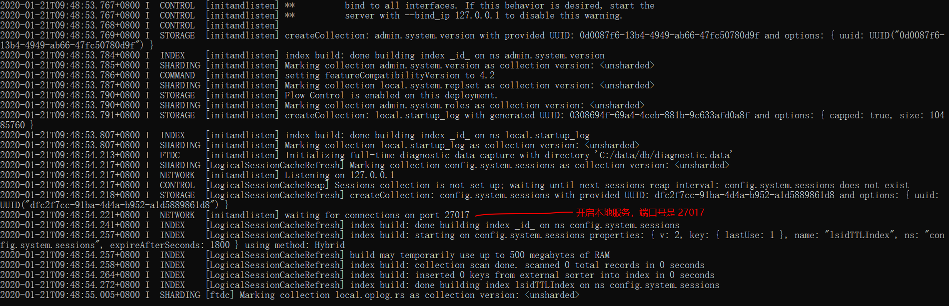 cmd,输入mongod启动mongodb服务器。如果出现下面的回显,表明开启服务成功。